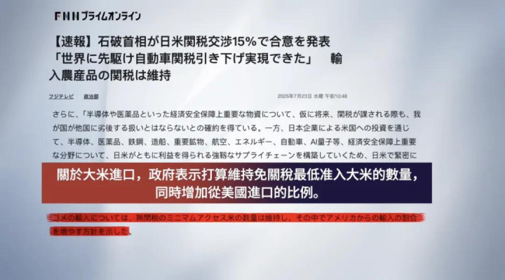 接下来,在美日多轮贸易谈判中,大米都成了一个重要内容。当地时间7月22日,特朗普在社交媒体上发文称,美国与日本达成贸易协议,原定25%的对等关税税率将下调至15%,日本将向美国投资5500亿美元并放开大米等农产品市场。