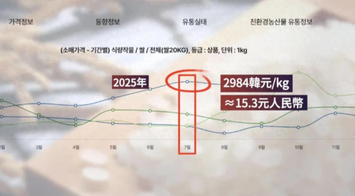数据显示,韩国大米零售价格在过去一年内,除2024年7月到9月,短暂下行至每公斤2559韩元,约合13.2元人民币,之后就一路上涨,到今年7月底,达到最高值2984韩元,约合15.3元人民币。而过去一年,中国的大米零售价每公斤仅在在6.5到6.6人元民币上下。