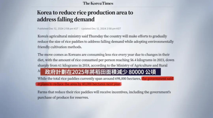 2024年底,韩国农业食品和农村事务部发表声明,称人均大米消费量从2018年的61公斤大幅下降到2023年的56.4公斤,为了应对需求下降,稳定大米价格,韩国政府通过提供补贴和奖励等措施,逐步减少水稻种植面积,将2025的目标定在了:减少8万公顷。