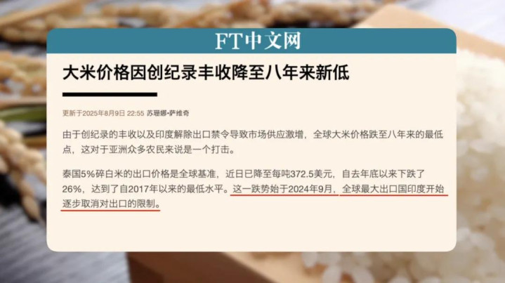 2025年8月8日,《金融时报》发表文章称:由于创纪录的丰收以及印度解除出口禁令,导致市场供应激增,全球大米价格跌至八年来的最低点。