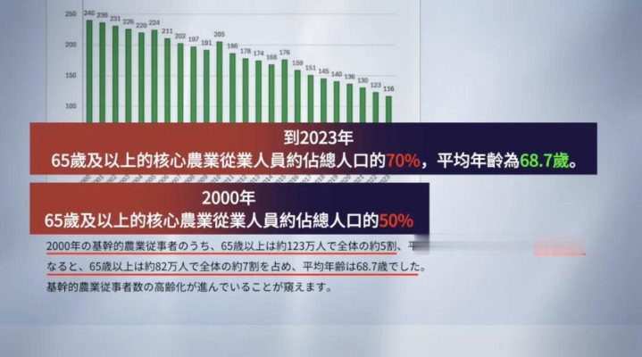 2024年10月的一份调查研究显示:日本自主经营的“核心农业从业者”的数量正在逐年下降,2023年与2000年相比,不足一半。其中,65岁以上的老年人占比,从2000年的50%增长到2023年的70%,农业从业者平均年龄达到68.7岁。