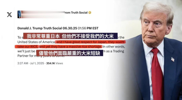 6月30日,特朗普在其社交媒体账号中发帖文称:“大家应该明白一些国家在与美国的关系中被‘惯怀’了,我非常尊重日本,但他们不接受我们的米,尽管他们面临严重的稻米短缺。”