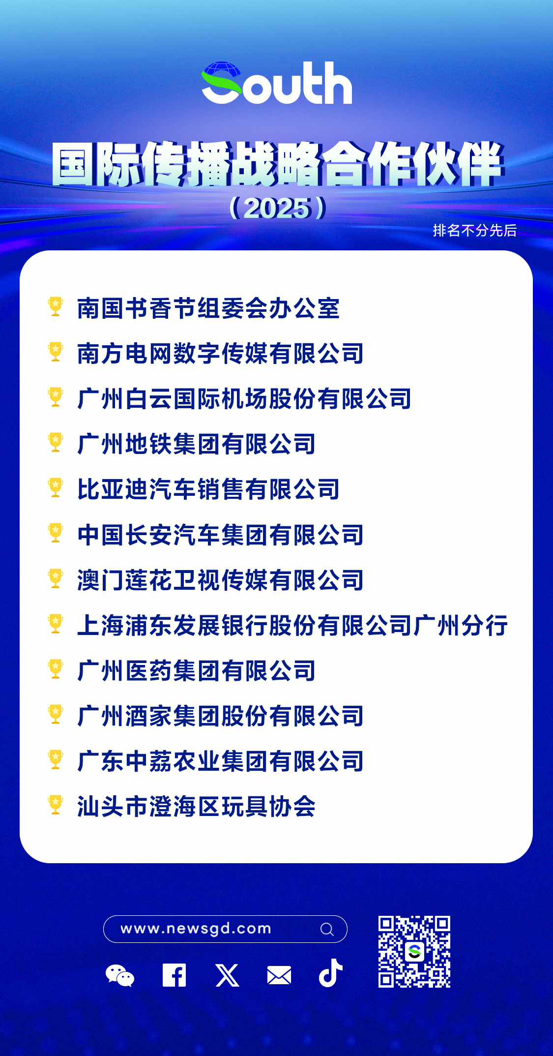 South不仅是一家媒体,更为广东政府部门、企事业单位、媒体及高校的涉外工作提供坚实支撑,是地区、城市、企业塑造国际品牌形象的核心合作伙伴,目前已经构建一个合作伙伴生态体系。会上,South为12个“2025年度国际战略合作伙伴”授予牌匾。