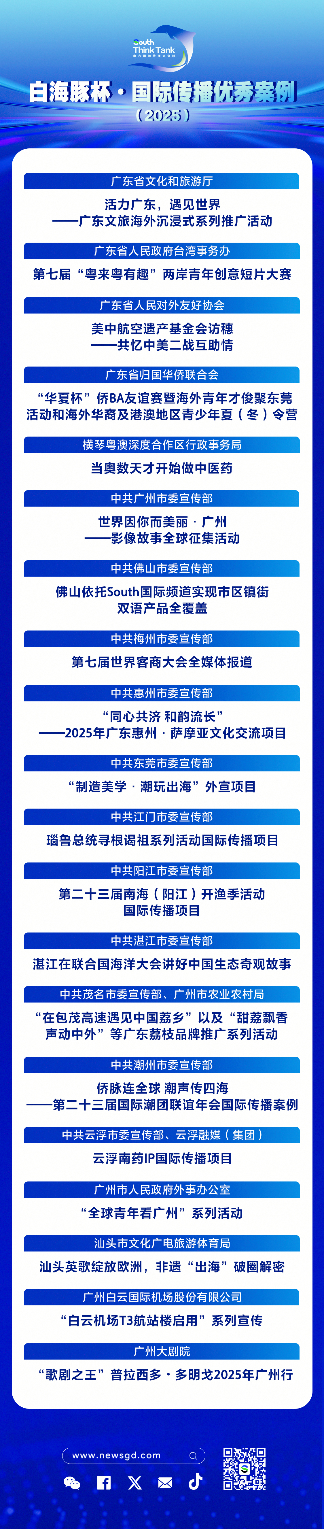 为进一步牵引带动广东国际传播工作,南方国际传播研究院于2025年12月发起首届“白海豚杯·国际传播优秀案例”征集活动。