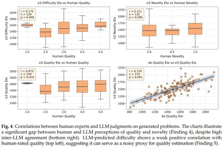 发现 4:人类专家和 LLM 在对问题质量和新颖性的判断上几乎没有相关性。
