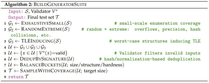 如图 1 所示,该框架始于验证器(Validator),它是整个系统的基石。其功能是确保任何给定的输入都严格遵守问题描述中指定的所有约束。一个验证器对于最小化漏报率(FNR)至关重要,因为它能防止正确的程序在格式错误的数据上失败。