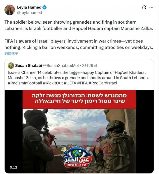 直播吧03月30日讯 记者Leyla Hamed近日在社媒转发了一个视频,炮轰了以色列球员参战的行为,并怒斥国际足联对此无动于衷。